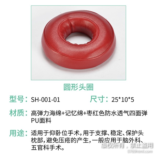 在醫(yī)用體位墊系列中,有很多種規(guī)格型號的體位墊,那么其中有一款圓形頭圈,不知道大家是否了解過,這在醫(yī)用體位墊系列中,它的咨詢人數(shù)是較多的,這款圓形頭圈形似環(huán)形游泳圈,中間空洞設計,能夠使患者使用時頭骨位置呈現(xiàn)懸空的狀態(tài),保護頭骨突出位置,防止長時間的壓力導致褥瘡的發(fā)生。